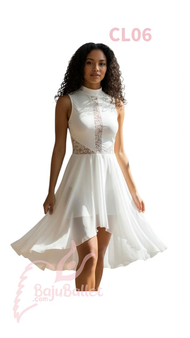 Kostum Contemporary & Lyrical CL06 ini terbuat dari material ringan yang flowy, memungkinkan gerakan lembut dan bebas. Detail brokat see-through menambah tekstur tanpa mengganggu fleksibilitas. Warnanya Putih polos, memberi kesan murni dan emosional, serta membantu menangkap cahaya panggung agar gerakan terlihat jelas dan bersih.