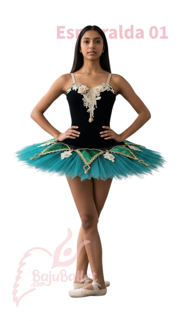 Esmeralda 01 adalah kostum Ballet warna Black-Green dengan bordir Gold mewah dan detail bunga elegan untuk penampilan yang memukau.