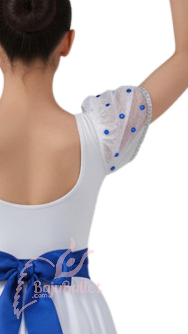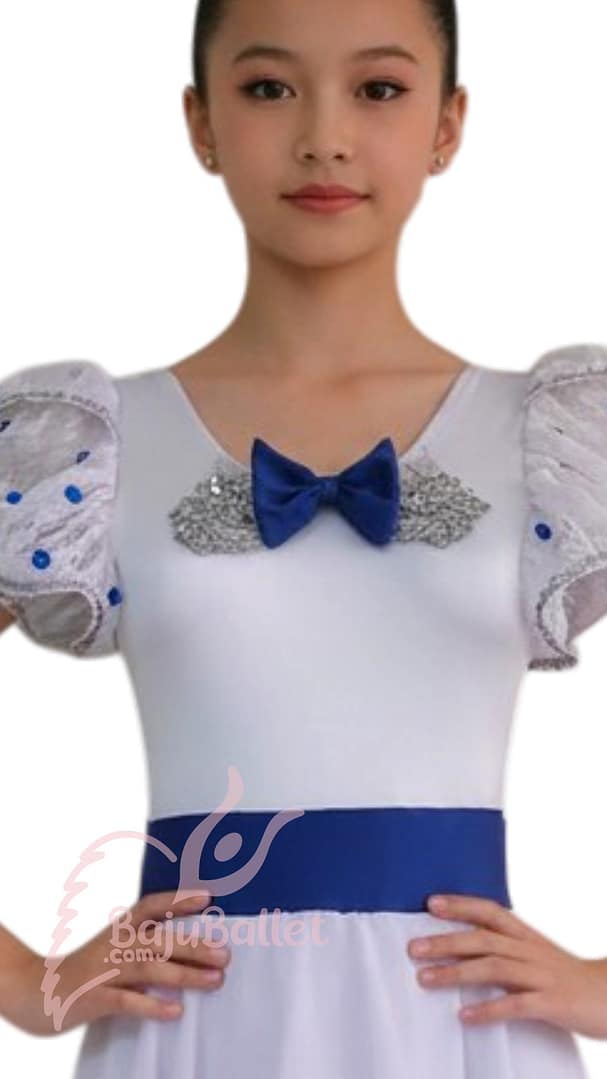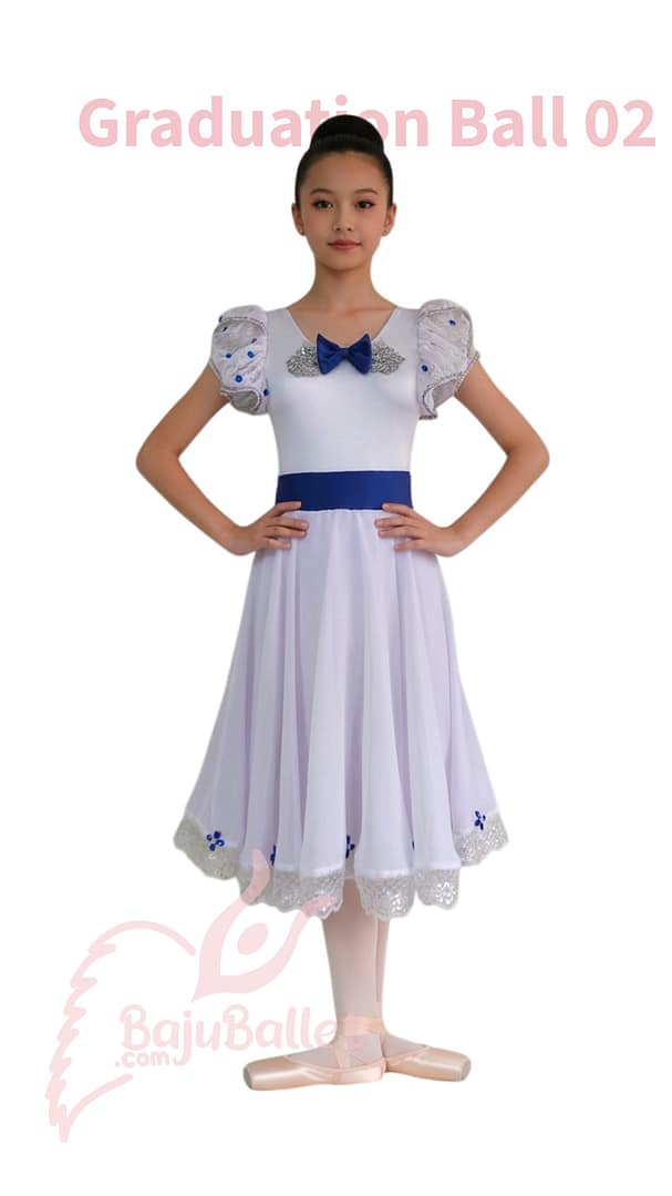 Skip to contentGraduation Ball 02; kostum warna Putih dengan hiasan rhinestones dan pita Biru elegan. Meningkatkan rasa percaya diri saat lomba Ballet.