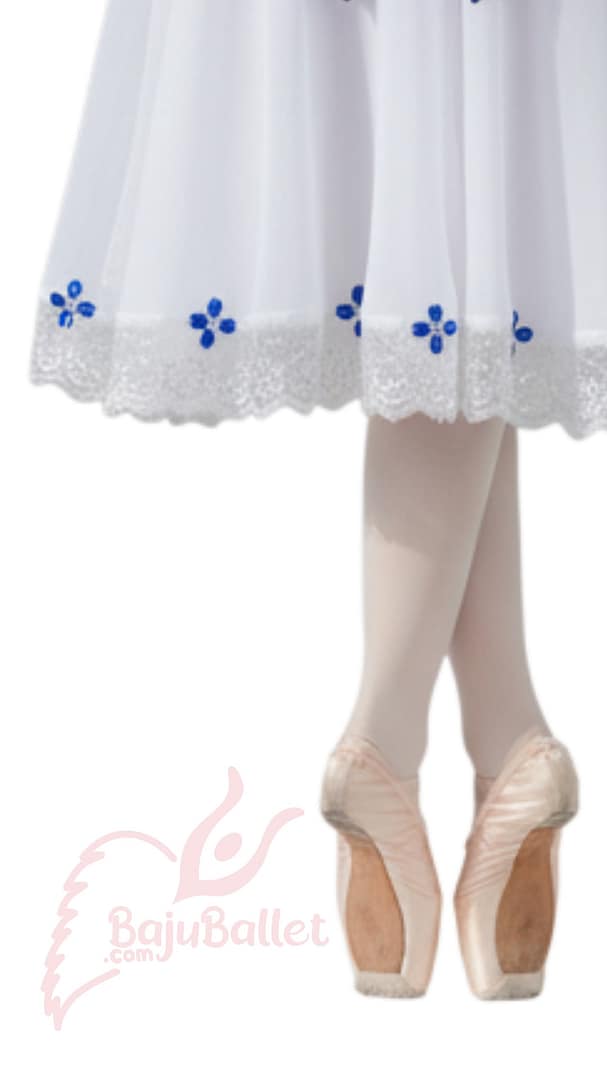 Dekorasi kostum ini menampilkan rhinestones biru pada bagian lengan puff dan di ujung rok, memberikan kilau halus saat bergerak. Di bagian dada, pita biru dihiasi detail brokat perak di sekelilingnya, menciptakan aksen elegan yang menarik perhatian tanpa berlebihan.