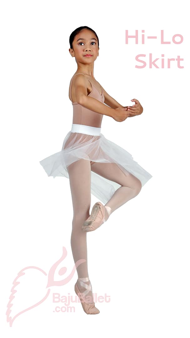- Hi-Lo Skirt adalah Ballet Skirt dengan potongan tidak rata dan memberikan kesan flowy (seperti dihembus angin) ketika dipakai menari