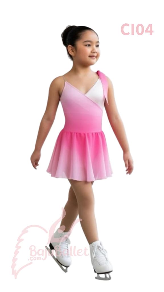 Kostum Ice Skating CI04 adalah kostum ice skating warna ombre pink, tali asimetris pita, rok chiffon ringan, feminin dan anggun saat berputar.