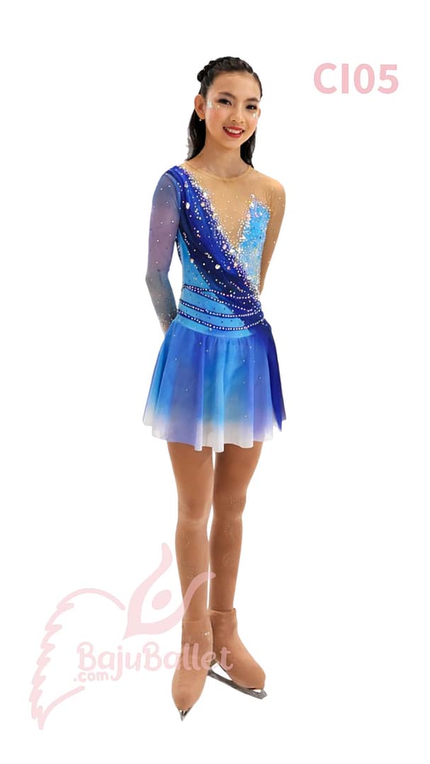 Kostum ice skating CI05. Elegan dengan warna ombre dan hiasan rhinestones. Dijamin meningkatkan performa saat dipakai untuk kompetisi.