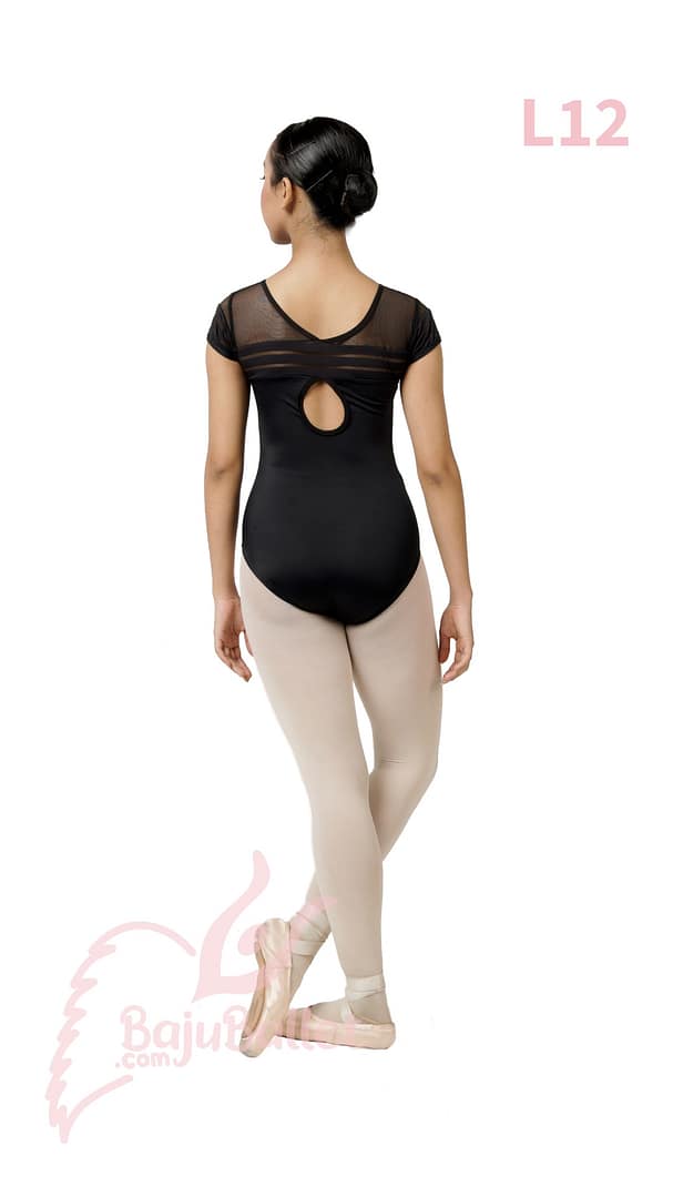 L12 adalah leotard lengan pendek yang memiliki desain tiga garis di kain mesh pada bagian dada dan keyhole pada bagian punggung.