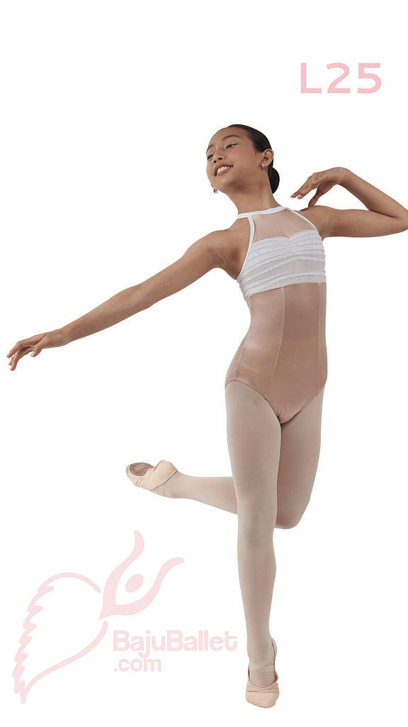 L25 adalah Leotard Ballet yang elegan dengan model Halter Neck dan lipitan kain Putih yang berpadu dengan warna dasar Dusty Pink.