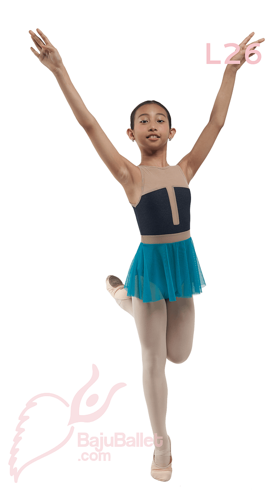 L26 adalah leotard dengan desain denim look yang casual & playful. Rok sudah tersambung ke leotard; mengembang ketika dipakai berputar.