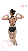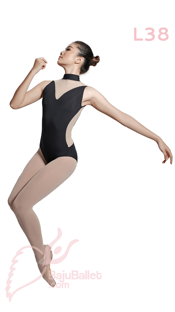L38 adalah Leotard dengan brand BajuBallet.com yang memiliki desain leher choker, kain jaring warna kulit di dada, pinggang dan punggung.