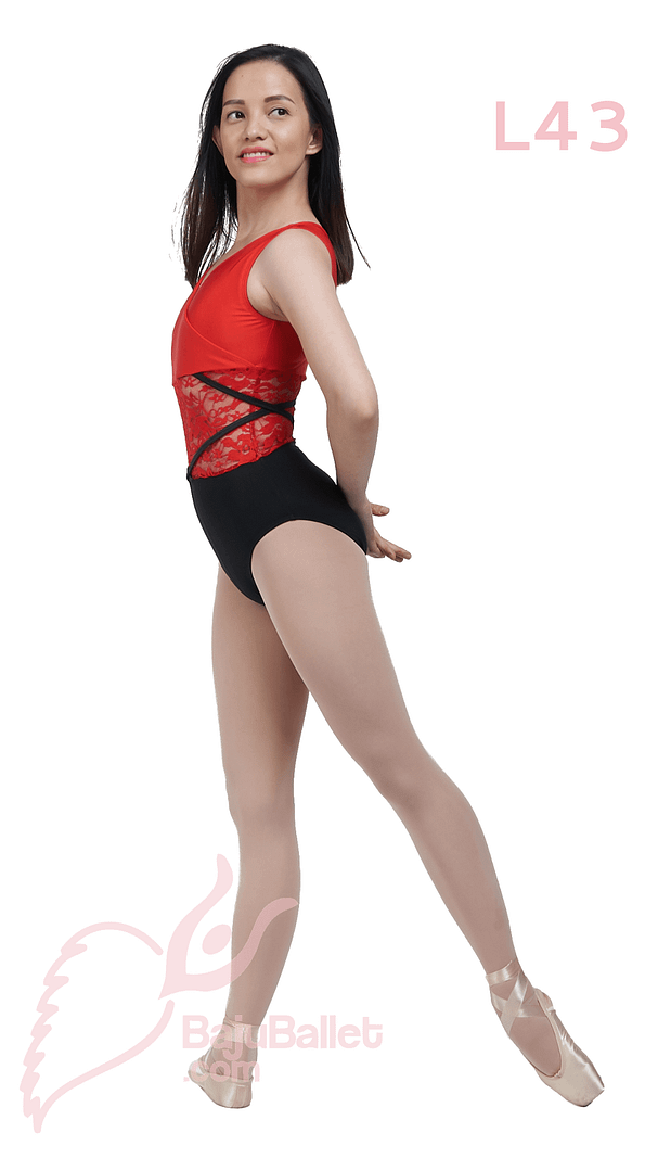 - Bagian tengah (antara dada dan perut) menggunakan kain brokat stretch warna Merah dengan ban elastis warna Hitam untuk memberikan warna kontras