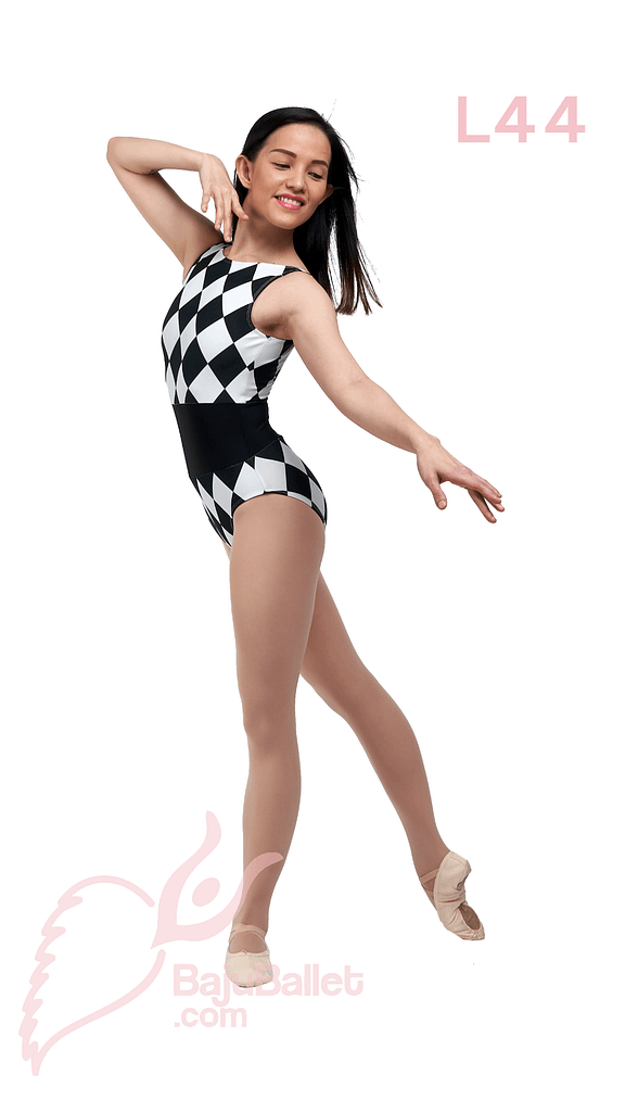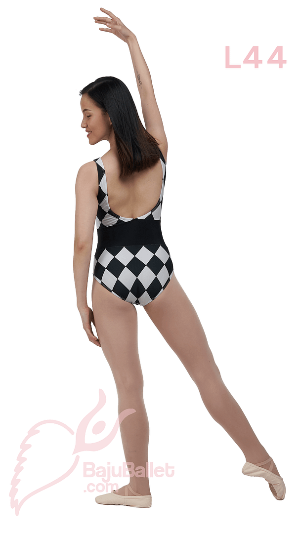 L44 adalah Leotard Ballet yang simple dan dinamis dengan motif print wajik warna Putih dan “ban pinggang” lebar warna Hitam.