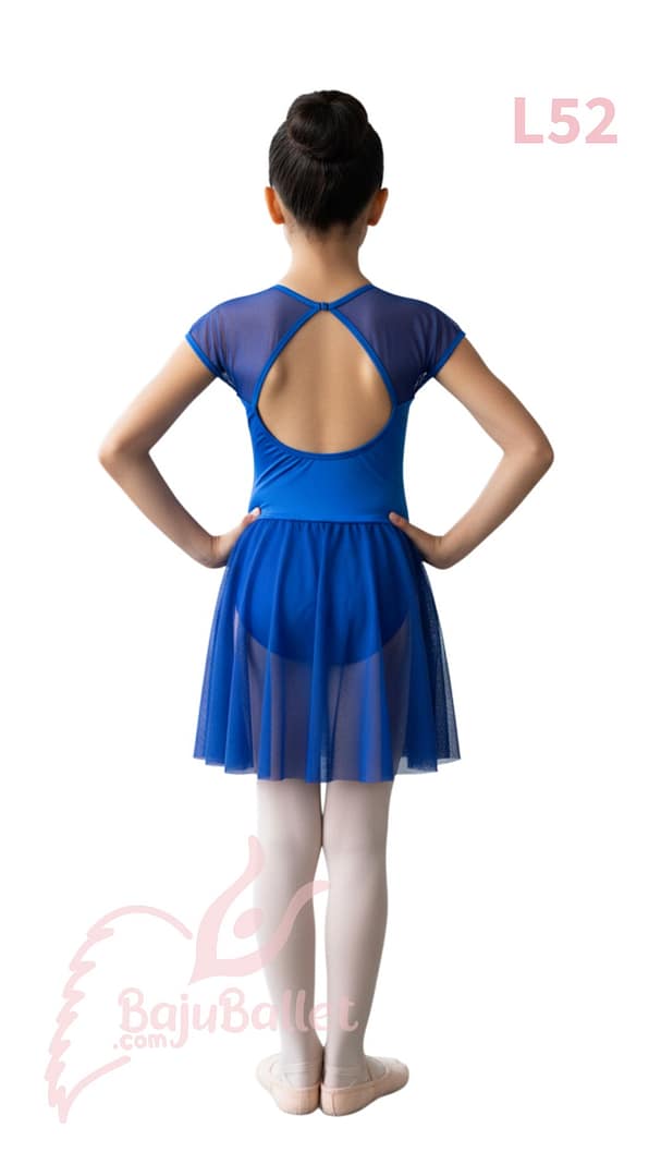 L52 adalah leotard dengan desain kombinasi bahan Nylon – Spandex dan Mesh, tanpa lengan, dengan rok yang menyatu ke leotard.