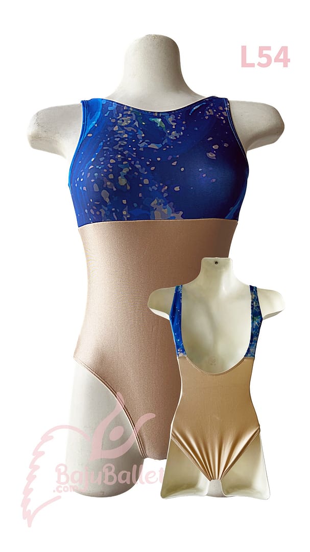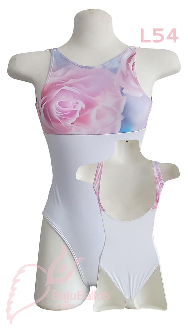 L54 adalah Baju Ballet Leotard ekslusif yang bagian dadanya menggunakan motif print sedangkan perut dan pinggang menggunakan warna solid.