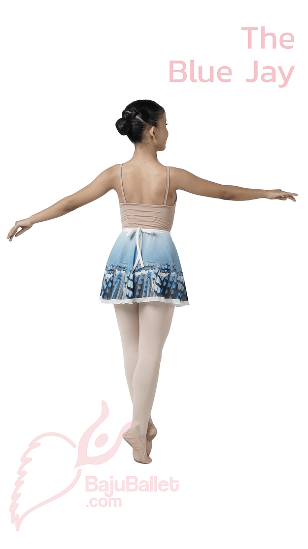 The Blue Jay adalah rok Ballet wrap skirt circular anak & dewasa dari bahan chiffon print. Terinspirasi warna & motif bulu burung Blue Jay.